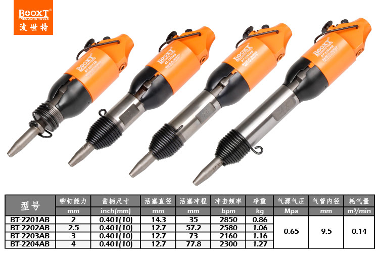東莞市強勁五金工具有限公司提供臺灣BOOXT波世特品牌氣動工具,風動鉚釘錘BT-2204AB廠家直銷,首件享特價。咨詢熱線:4008301980